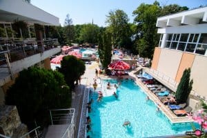 Alte facilităţi: restaurant (NOU 2014!), terasă, piscină interioară cu apă termală, 4 piscine exterioare cu recirculare şi apă termală (2 bazine de relaxare wellness cu apă termală şi masaj cervical, masaj lombar, paturi cu hidromasaj, perdea de apă şi pool bar, bazin de înot, bazin pentru copii), plajă generoasă cu sezlonguri internet, lifturi, transfer aeroport